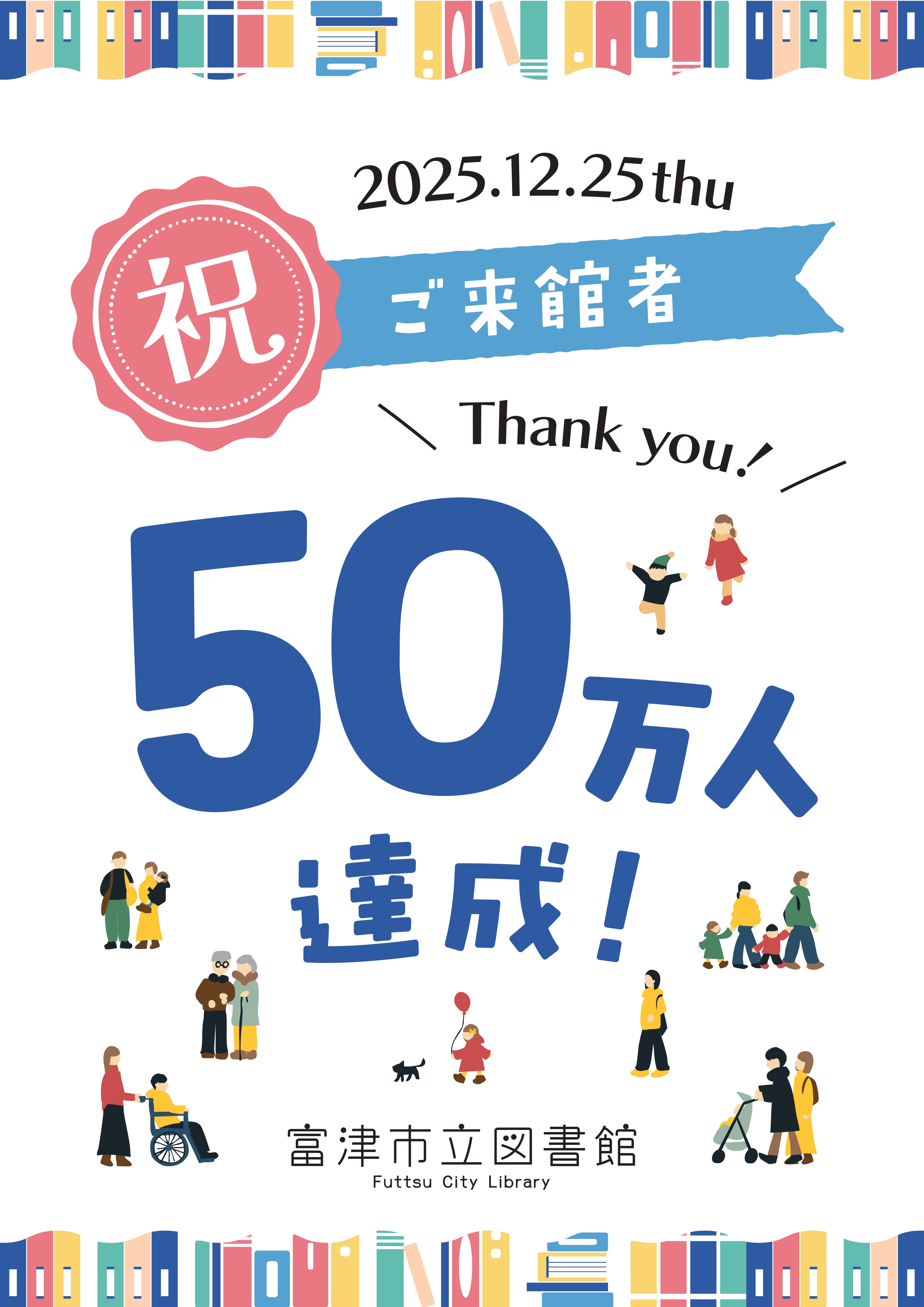 来館者50万人達成!!! 富津市立図書館は2025年12月25日(木曜日)で来館者50万人を達成いたしました!! 市民の皆さまのご愛顧に感謝いたします。 これからも富津市立図書館をよろしくお願いいたします。