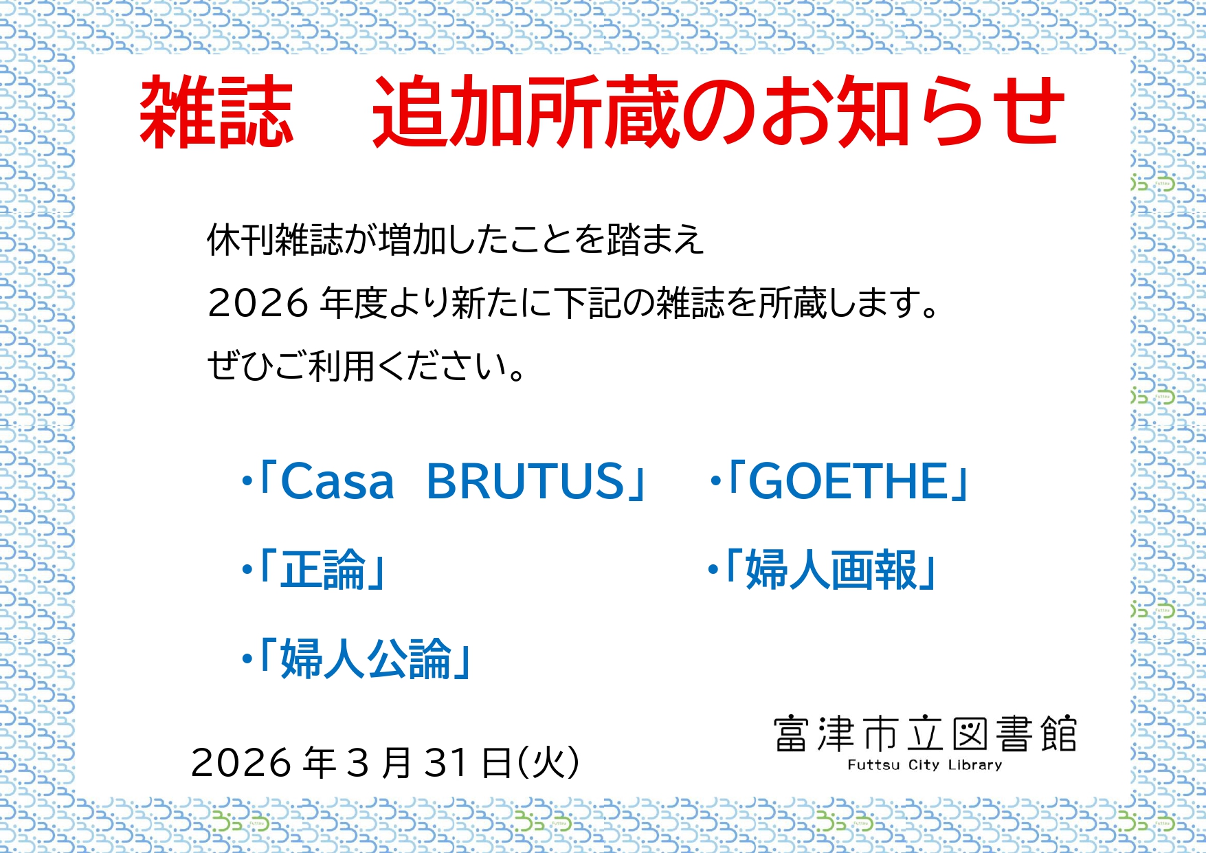 雑誌 追加所蔵のお知らせ 休刊雑誌が増加したことを踏まえ、 2026年度より新たに下記の雑誌を所蔵します。 ぜひご利用ください。